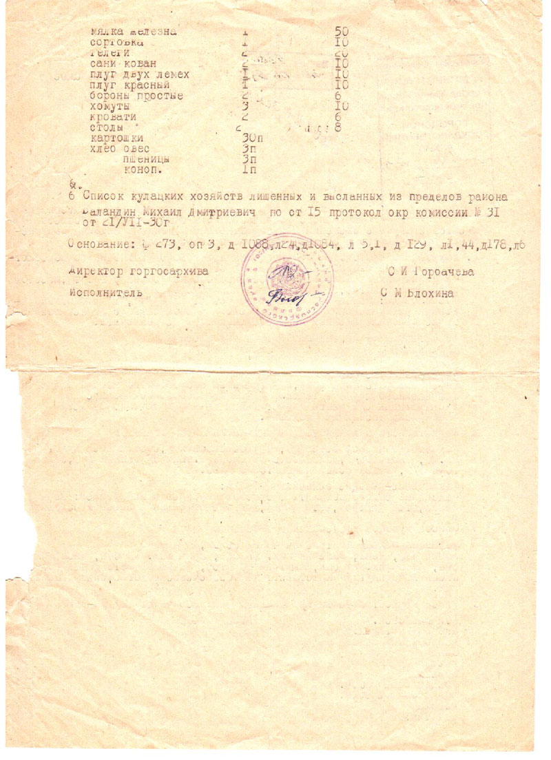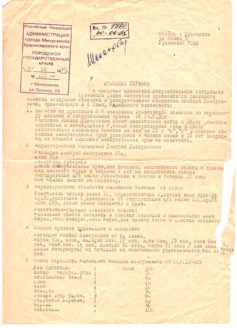 Наш прапрародитель был лишён избирательных прав в 1928 году, раскулачен в 1930 и выслан в Ольховку в 1931 (1930?) году. В выписке из документов исполкома Ермаковского райсовета, выданной Минусинским государственным архивом сказано, что Михаил был лишён избирательных прав как владелец маслобойного завода и за применение наёмного труда (приложение 5).