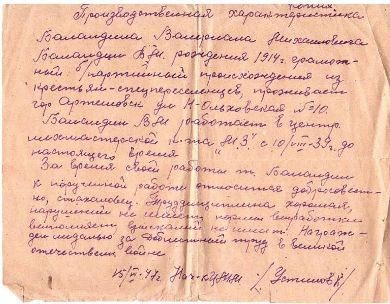Баландин Михаил имел репутацию очень хорошего человека. В спецпоселении его все уважали и любили. Об этом мы узнали от жителей, которые и по сей день живут в Артемовске, ныне уже небольшой деревушке. Эти жители были детьми, когда наш прадед с семьёй жил в г. Артёмовске. Они рассказали нам о том, что Михаил был добрым человеком, постоянно угощал детей яблоками из своего сада, относился приветливо ко всем жителям, приходил в случае беды на помощь.