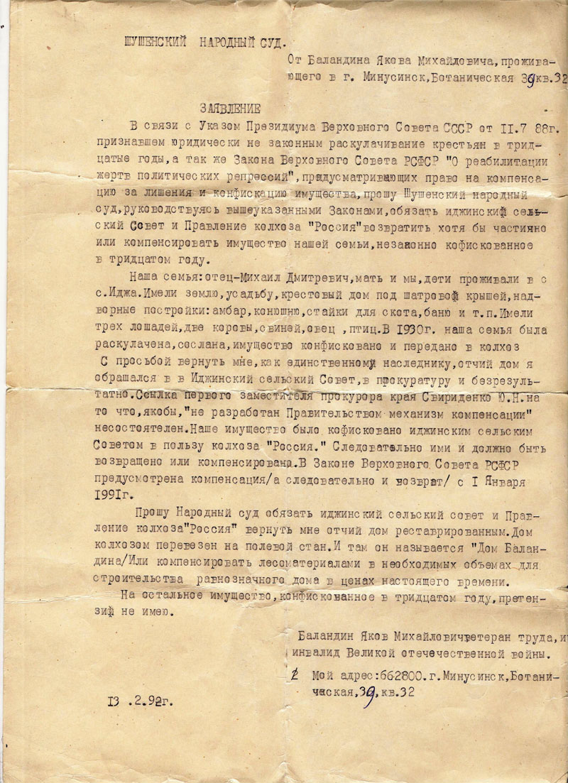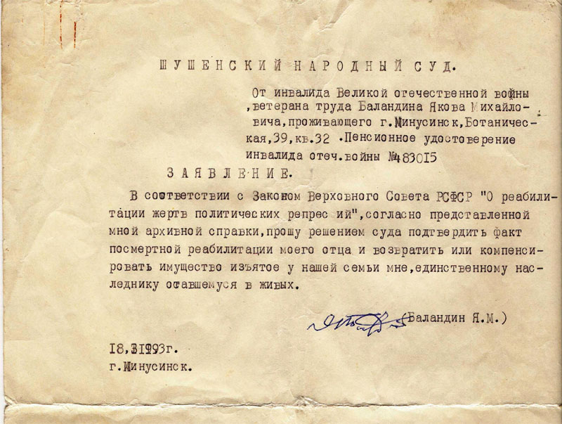 Пятнадцать лет назад третий сын Михаила Дмитриевича Яков Михайлович Баландин добился компенсации за раскулаченное хозяйство. Имеются документы в виде справки и заявлений, подтверждающие этот факт (приложение 13). Но его действия были направлены не на возможность получить материальную компенсацию; им владело желание восстановить справедливость и реабилитировать своего отца и свою семью. Мы считаем, что ему это удалось.