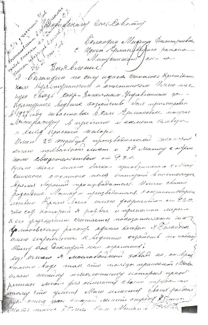 При разговоре с родственницей нашей семьи – Верой Баландиной (приложение 6) , которая была юной девушкой во время раскулачивания, мы узнали, что из многодетных семей детей отдавали на содержание в семьи, которые были чуть богаче. Эти дети в приёмной семье помогали в работе, но при этом они питались вместе с семьёй, спали в хозяйском доме и пользовались теми же благами, что и хозяйские дети. В бедных семьях свой ребенок часто был «лишним ртом» и зажиточные семьи, по сути, проявляли милосердие по отношению к малоимущим согражданам. Но власти не разбирались в этих «тонкостях жизни», тут налицо была эксплуатация человека человеком. Для верхушки общества не было важно, что наёмные работники были как свои в хозяйской семье, что так они жили в лучших условиях, нежели в своей семье.