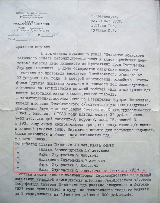 В документах архивного фонда «Исполком Абанского районного Совета рабочих , крестьянских и красноармейских депутатов» имеется дело лишенного избирательного права Штернфельд Эдуарда Югановича. В деле содержатся следующие документы: