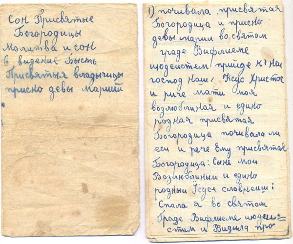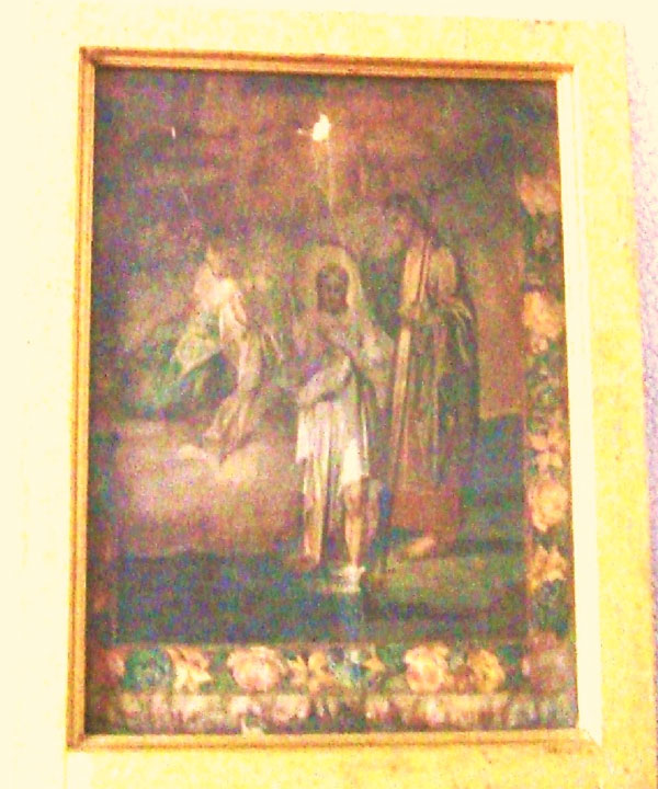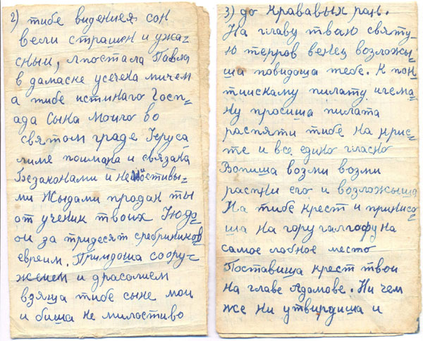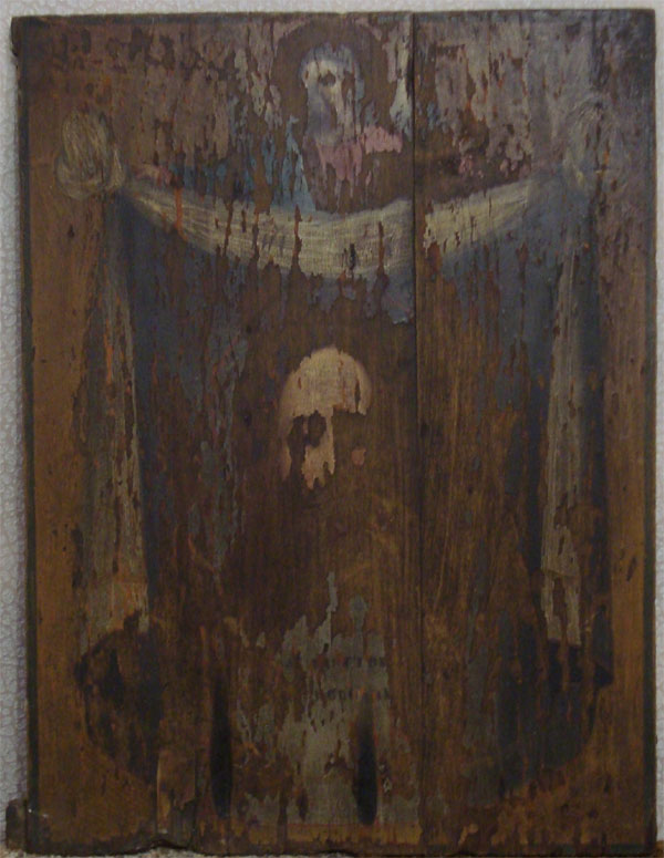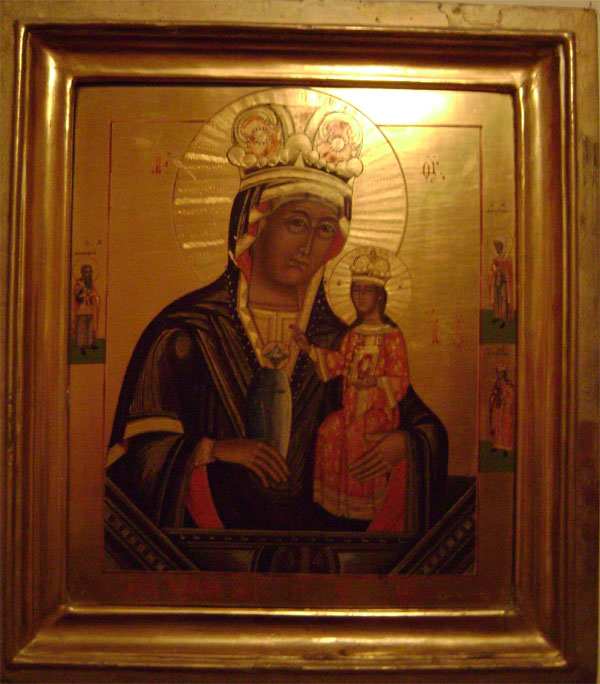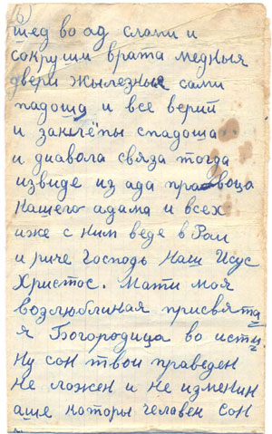 Икона. Иногда образ на иконах «понавленный», то есть реставрированный, всё-таки иконам более трёхсот лет. Сначала на дерево накладывали грунт, а только потом краску. Под образа отводится в доме красный угол. В России старообрядцы не имели права строить храмы. Их церкви должны были выглядеть как обычные дома – даже в те времена, когда охота на раскольников давно закончилась. Церковь у них называется собором. «Собор отдельно не выпячивается, потому что это – жилой дом. Хотели строить отдельный дом. Но креста над ним всё равно бы не было, это скрывается. В соборе иконы не стоят всё время открытые, за занавесью». В приложении 4, лист 1 - старообрядческая икона. Младенец показывает двоеперстие.