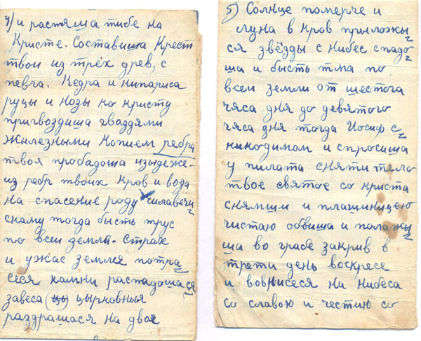 Молитвы. Староверы обязаны блюсти все старинные православные посты и праздники, посещать место, где отправляется служба, и молиться под руководством наставника. Вообще старообрядцы часто молятся. Они соблюдают суточный круг моления: вечерю, павечерицу, полуношницу, утреню, обедню, часы. В приложении 3 мы поместили молитву старообрядцев (имя бога в ней написано по-старообрядчески – Исус). Молятся по старинным книгам. «Духовные правила все в книгах прописаны. – говорит Андриян.- В субботу молимся утром с 6 до 8 или с 3 до 9 ночью. Молится почти вся деревня, собираемся в соборе. В соборе человек благословляется Христа ради у наставника и сам читает, потом все молятся и поют. Я по-старославянски плохо читаю, потому в соборе не читаю. В другие дни молимся в доме. Кто как дома молятся. Молитву начинает и большой (в значении – старший), и маленький».