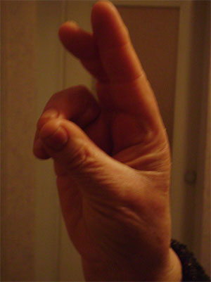 Крест. Крестятся староверы двоеперстно, при этом мало сложить средний и указательный пальцы, нужно ещё из трёх остальных «троицу» построить (приложение 4, лист 1). Получается пятиперстие. Новые календари, кресты, по словам Андриана, приходят из Новозыбковской церкви, выписывают их по почте.