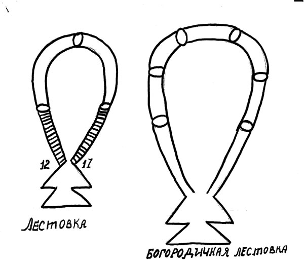 У каждого старовера есть лестовка. Лестовки – что-то типа чёток. Лестовка или лествица – означает «лестница». Староверы верят, что по ней можно на небо взобраться. Она представляет собой украшенную ленту. На ней четыре треугольных «лапостника» - это Евангелия. Узелки на лестовке называются «бобочки». По лестовкам считают молитвы и поклоны. Наш информант описывает лестовку так: «Лестовка – это кожаная лента или тряпочная, а на ней бубышки. Лестовку держат в левой руке, а когда кланяются, чтобы лестовка не лежала на полу, её кладут на подрушник». Староверы используют несколько видов лестовок: «Лестовка есть на 102 поклона, там на одном конце 12 бубышков, а потом побольше бубышок, а на другом конце 17 бубышков. Богородичная лестовка – через 12 бубышков. Лестовки заказывают из монастыря. Бубышки из красивой ткани, внутри бумажка. Лестовки красивые, как фирменные. Лестовка не ко всем молитвам. Есть лестовка на один поклон». Даже у детей есть свои лестовки: «У детей маленькие лестовки». Старообрядцы всегда носят с собой лестовки: «Лестовка всё время с тобой. Если далеко идёшь – молитву творишь». Но, возможно, во время поездок лестовку оставляют дома. Во всяком случае, увидеть лестовку не удалось. Описание лестовки сделано со слов Андрияна, а рисунок (приложение 4, лист 4) – по его наброску