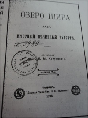 В 1896 году в Томске была издана книга В. М. Крутовского «Озеро Шира как местный лечебный курорт». Общество врачей активно изучало лечебные свойства соленых озер на юге Енисейской губернии. В 1912 году Владимир Михайлович совершил поездку по озёрам Западной Европы — Крутовский интересовался курортным делом. По предложению Крутовского был организован «Комитет для помощи бедным больным на озере Шира».