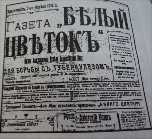 Газета Белый цветок-органа Красноярского отдела Лиги. Газета призывала:»Покупайте белую ромашку, внесите каждый свою лепту по борьбе с величайшим народным бедствием-чахоткой!»