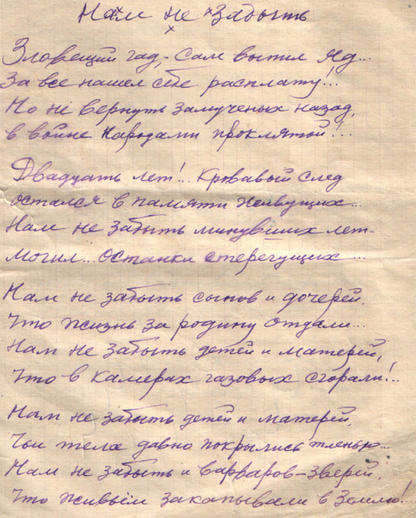 Десять лет тяжелой жизни, незаслуженных обид, унижений, издевательств, голода и холода… И наконец, последний удар, когда после десяти лет я приехал в 1947 году с сибирского лагеря домой больной, разбитый физически и морально, моя жена, с которой я прожил до репрессий двадцать лет, как увидела меня, всплеснула руками и закричала: «Ой, пропала моя жизнь! И зачем ты приехал? Там, в Сибири, нашел бы себе работу, нашел бы себе бабу, да и жил бы себе… А теперь у меня отберут пенсию за Женю». (Старший сын Евгений погиб на войне).