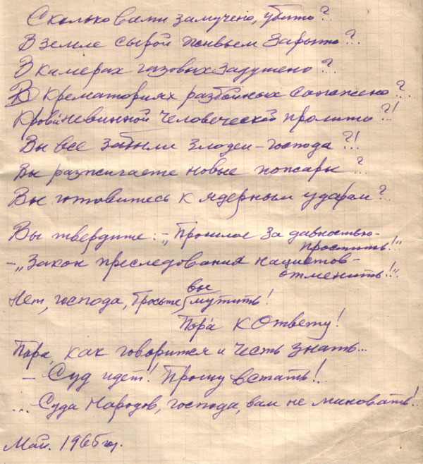 Мне и до сей поры дивно, как я мог пережить те гибельные часы? Как не сошел с ума! А были такие, что сходили с ума, были самоубийцы. Скажу Вам, что двадцать лет пребывания репрессированным не прошло для меня бесследно (1937 год – репрессия, 1957 год – реабилитация). Неожиданно пришла свобода. Я низко кланяюсь ЦК нашей партии, который раскрыл перед всем советским народом мерзкие дела заклятого агента и провокатора Берии и культ личности Сталина. Но организм мой подорван: нарушена центральная нервная система, сердечные приступы – все это свернуло меня с пути моих творческих поисков, моей литературной работы. Наша медицина пока еще поддерживает меня… И не только медицина.