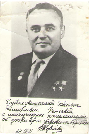Наталия Королёва в книге «Слово об отце» писала, что отец попал в лагерь, где лечила его женщина врач Татьяна Дмитриевна Репьёва. Она с ней встречалась на Колыме в 1991году. Н. Королёва напомнила ей, что Татьяна Дмитриевна приносила из дома картошку, из которой отец и другие больные цингой выжимали сок и натирали им свои дёсны.