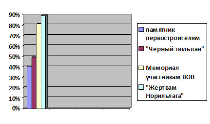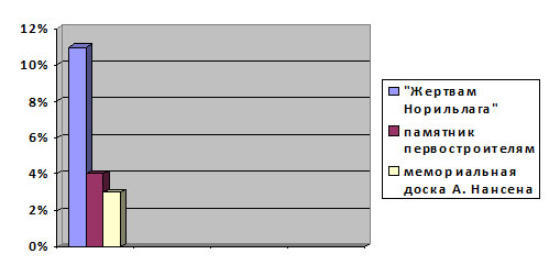 Более подробно немногие норильчане могут рассказать о памятниках, мемориальных досках. Из 247 опрошенных респондентов могут рассказать об истории возникновения памятника «Жертвам Норильлага» - 27 человек (11%), 10 человек (4%) о мемориальной доске первостроителям г. Норильска,7 человек (3%) - о памятной мемориальной доске в честь А. Нансена.