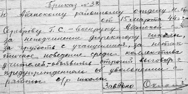 «В целях систематического контроля и осуществления руководства за работой классных руководителей ввести с сего числа еженедельные письменные отчёты классных руководителей о проделанной воспитательной работе в классе за неделю». Значит, не все было в порядке в школе. Своей строгостью меня удивил п. 5 этого же приказа: «Учительница Гревцева А.П. 13 ноября совершила прогул в течение всего дня. Прогул связан с проводами мужа в ряды Советской Красной Армии. Передать о совершившемся факте дело на рассмотрение ЗавРОНО». Ещё более строгое наказание понесла учительница Ношенской СШ Веселкова Ф.М., которая «Совершила сего числа прогул, опоздав на занятия на 30 минут.