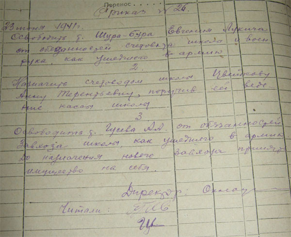 Передать дело о Веселковой заведующему Абанским РОНО для привлечения к ответственности».[Книга приказов Ношенской школы 1938-1944, приказ №47 от 19 ноября 1941.] И еще такой же приказ: «Запретить учителям Гревцевой и Положенцовой выходить на урок, не имея утверждённого завучем или директором конспекта урока»[Книга приказов Ношенской школы 1938-1944 приказ №2 от 5 декабря 1941г. ]. Я сделала вывод, что никто не собирался даже проступки учителей списывать на трудности военного времени.