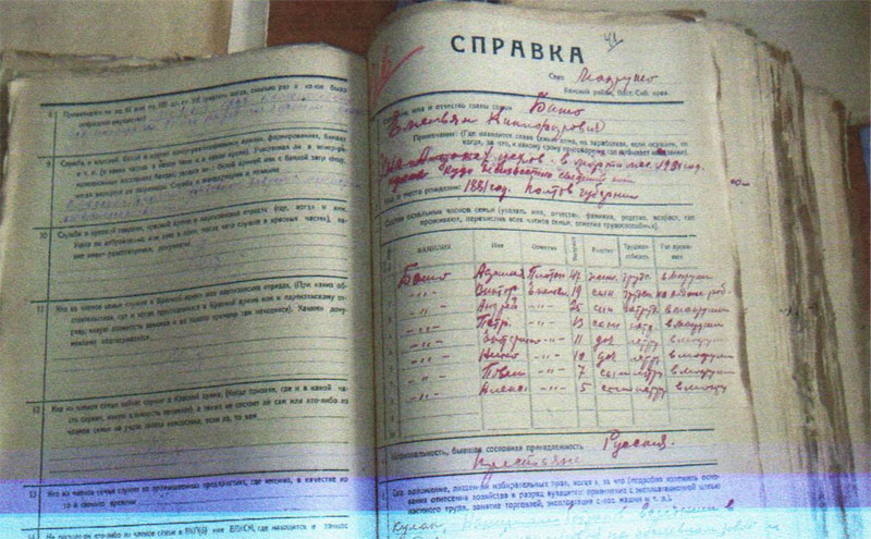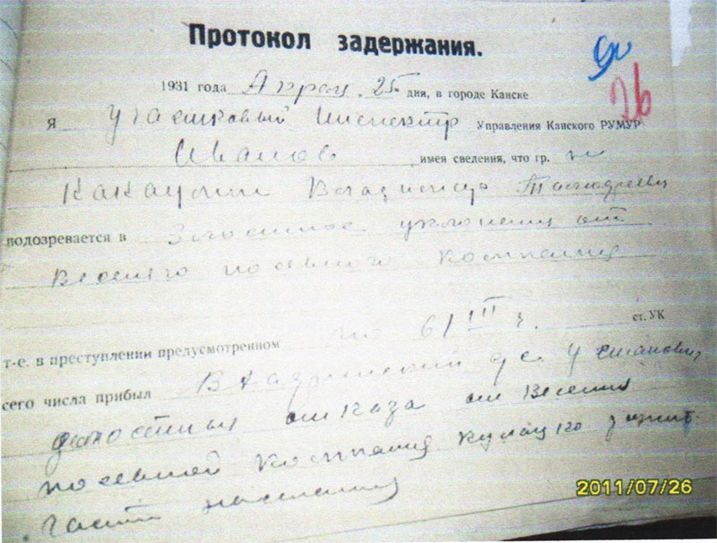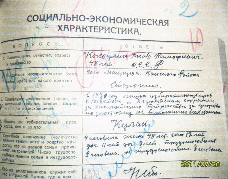 Заседание Канской Полит-тройки по вопросу конфискации имущества кулаков 16 августа 1931 года: Окладников Михаил, Окладников Александр - конфисковать хозяйство и имеющиеся машины. Мулинцев Федор, Астафьев Владимир - конфисковать все хозяйство. На каждое кулацкое хозяйство была заведена карточка. Карточка кулацкого хозяйства за 193О-1931гг.: