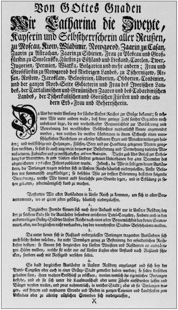 22 июля 1763 года Екатерина II обнародует «Манифест о даруемых иностранным переселенцам авантажам и привилегиях» (Приложение №1), тогда же создается «Канцелярия опекунства иностранных», возглавил которую любимец императрицы граф Григорий Орлов. Был создан реестр земель, желаемых для заселения. На этих землях должны были разместиться новые поселения, позже названные колониями. Целью всех этих мероприятий была отнюдь не забота коронованной немки о своих немецких согражданах, а укрепление границ огромного государства России. Екатерина знала, что отведенные земли чаще всего подвергаются набегам и разорению кочевыми народами.