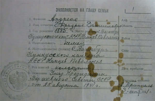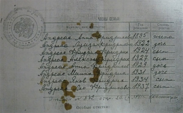 Справка о высылке семьи Андриас.
