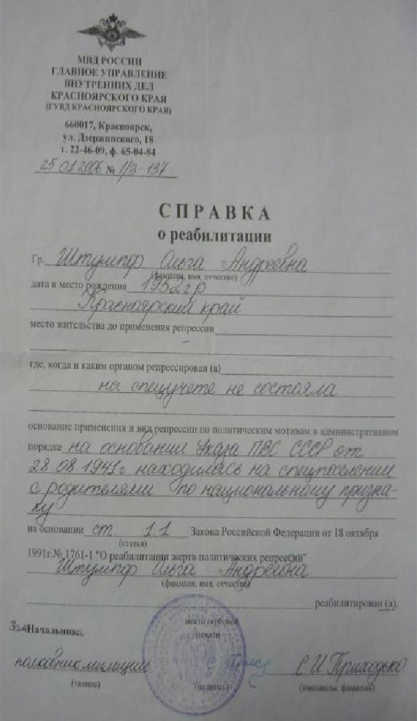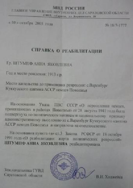 (В) Справка о высылке семьи Штумпф.