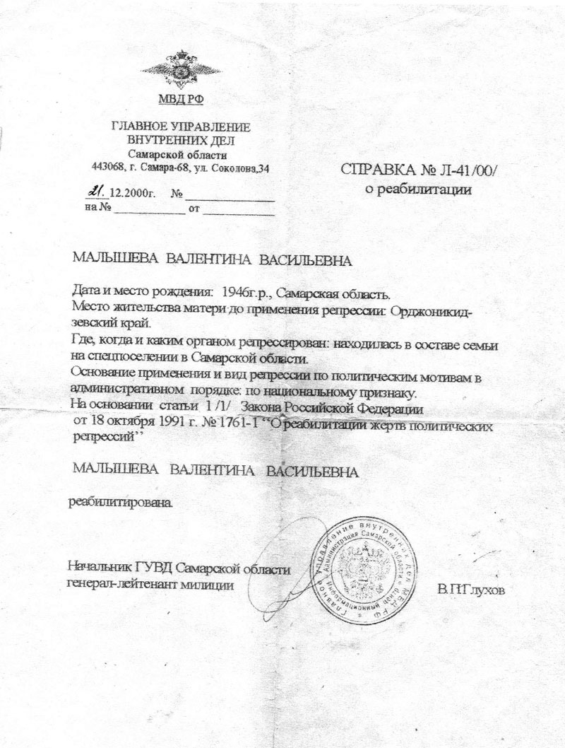 В 1991 году вышел «Закон РСФСР от 26 апреля №1107-1 «О реабилитации репрессированных народов». В этом законе государство признало свои ошибки. Но несмотря на то, что это было огромной радостью, это время оставило отпечаток большой в моей судьбе. Время ушло. Обидно, конечно, что когда мои одноклассники получали специальность, я не имела такой возможности, надо было находиться под комендатурой. Нельзя без содрогания, без слез на глазах воспринимать то, что пришлось нам вынести. Но, несмотря на искалеченную судьбу, мы продолжаем верить в счастливое будущее.