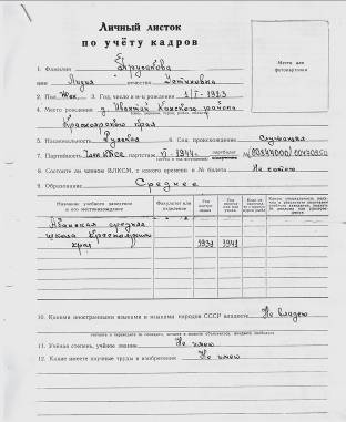 Смолина Анна Ивановна не работала в школе, но была педагогом по образованию - окончила Педагогический техникум в 1946 году. В учетной карточке, отмечено, что служила Анна Ивановна в звании сержанта, указана и профессия военная: «радиоспециалист, радио станции средне и дальней мощности». Призвана Анна Ивановна на действительную службу 21 августа 1941 года Абанским военкоматом. Проходила военную службу в разных частях.