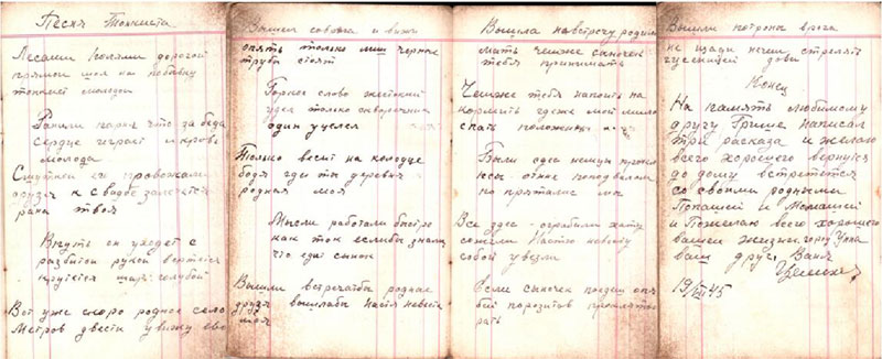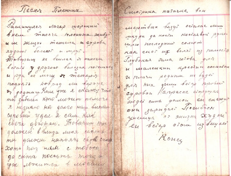 Бабушка Гоар переводит мне блеклые записи, написанные по-армянски на рассыпающихся страницах: «29 ноября нас повезли в город Николаев в общий лагерь. Нас держали в очень жестоких условиях, кормили раз в 3 дня, давая 50 граммов хлеба из опилок и муки и стакан теплой воды. Тысячи пленных умирали от голода и мук. В один день дали обед из мертвой собаки. Друг шепнул, чтобы я это не ел, и за это его застрелили прямо на моих глазах. 9 марта 1943 года нас перевели в местечко Шепетовка. А через месяц, 9 апреля отправили в Германию в 326 концлагерь». В записной книжке прадеда есть стихотворение друга Ивана «Песня пленных». Парень переделывал по - своему, широко известную в советское время песню «Раскинулось море широко». Я предоставляю слово самому автору: