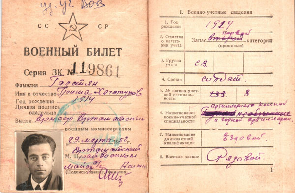 Я держу в руках военный билет Гриши Галстяна, выданный военным комиссариатом Арташата 29 марта 1952 года. Страница 11- мое сердце сжимается больно-больно. Страница озаглавлена: «Сведения об участии в Великой Отечественной войне и других войнах», а ниже указано - «не участвовал». В 1952 году факт плена стал причиной для отказа, принимать во внимание военное прошлое моего прадеда. Никто не хотел вспомнить страницы его биографии в пылающем Севастополе, который он защищал вместе с другими советскими солдатами.