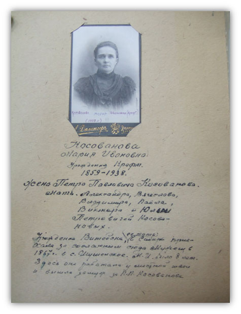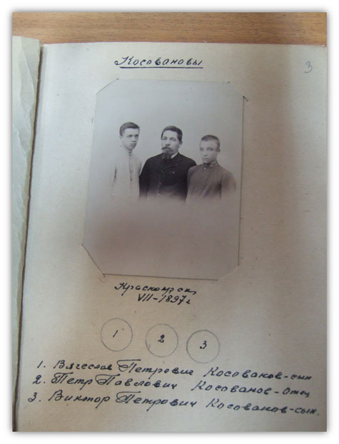 Нам известно, что Мария Ивановна Косованова, мать Вячеслава Петровича была сестрой известного красноярского губернатора Ивана Ивановича Крафта. Об этом интересном человеке можно написать отдельную работу, но мы обратили внимание на другое. Мать – бывшая дворянка, дядя – бывший губернатор. А.П. Косованов вспоминает, что когда И.И. Крафт приехал губернаторствовать в 1913 году в Красноярск, где жила большая часть его семьи, он был очень дружен со своим племянником, В.П. Косовановым, служившим в переселенческом управлении тогда. Как утверждает А.П. Косованов, мысль о строительстве нового здания музея возникла у губернатора с подачи Вячеслава Петровича. И даже когда И.И. Крафт скончался, все свое личное имущество он завещал В.П. Косованову. С тех пор в семье Вячеслава Петровича хранится серебряное блюдо, подаренное И.И. Крафту (Его изображение вы можете увидеть в нашей работе), и серебряные подстаканники. Эти реликвии сегодня хранит внучка В.П. Косованова.