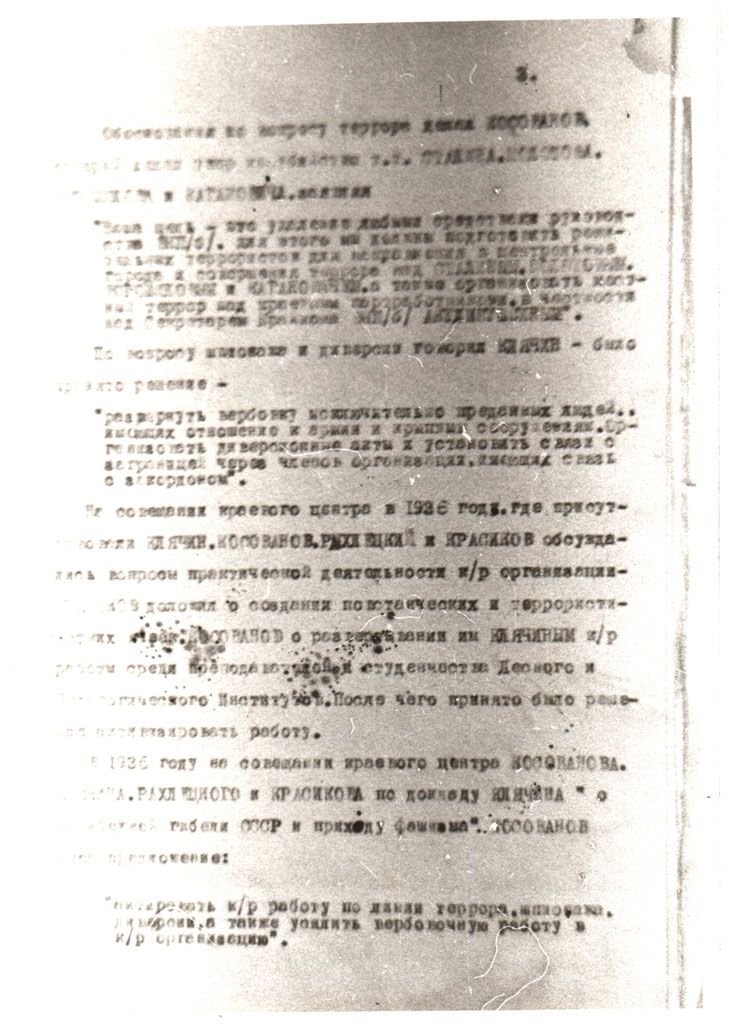 В 1933 году их организация пыталась совершить террористические акты над Ворошиловым в Красноярске в период его приезда, но им помешала охрана, а позднее они пытались совершить теракты над Акулинушкиным и Кагановичем».