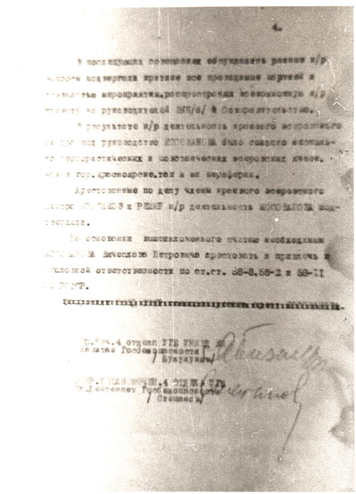 В архивах общества «Мемориал» мы находим «Постановление об аресте», «Справку о контрреволюционной деятельности гражданина Косованова Вячеслава Петровича», архивную справку от 25-го III-го 1996 года, которая была предоставлена красноярским краевым архивом. А в архиве А.П. Косованова мы нашли справку о реабилитации В.П. Косованова.