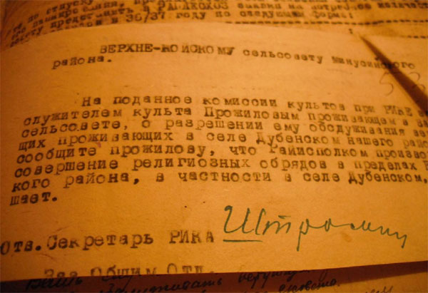 Наконец, в тоненькой потрёпанной папочке обнаружили листочки, из которых узнали, что молитвенный дом был закрыт в 1925 году, но осталась церковная община, которой передали церковное имущество. Жители села Дубенского просили разрешения на проведение церковных обрядов священником о. Георгием. РИК (районный исполнительный комитет) не разрешил совершать обряды, о чём свидетельствуют документы: