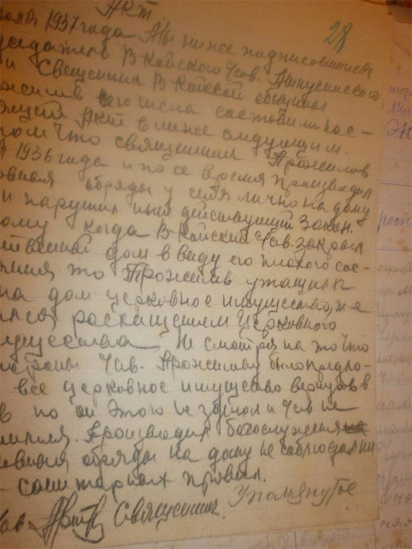 До последнего дня он занимался духовной деятельностью, это подтверждают записки, распоряжения, акты. Мы предположили, что основанием для ареста мог послужить акт от 30 июля 1937 года, в котором сообщается о том, что Прожилов Г.Г. продолжает проводить богослужения и совершает на дому религиозные обряды, тем самым, нарушая законодательство, обвиняется в расхищении церковного имущества.