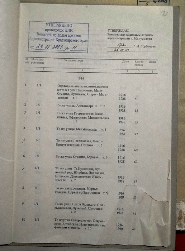 В ходе предпринятого исследования были изучены 132 частных усадьбы жителей Минусинска, информация о которых содержится в описях местных городских домовладений за 1916 г. Все обследованные усадьбы располагались компактной группой на двух параллельных улицах города, Гоголевской и Ново-Присутственной, начавших застраиваться преимущественно в 20-е–50-е гг. 19 в. Примерно 1/5 часть жителей этого микрорайона являлись накануне революции старожилами Минусинска и носили фамилии (Фроловы, Поляковы, Абросимовы, Стародубцевы, Орешниковы, Константиновы, Филимоновы, Баховы, Черкашенины, Бяковы, Широковы, Черкашенины, Шикины, Скобелины, Шашины, Солдатовы, Токаревы, Гурковы, Халевины, Горностаевы, Лопатины), известные здесь уже с 1850 г. Следует отметить, что в период проведения первой Всероссийского переписи населения 1897 г. к числу уроженцев города относились 56.21% его жителей, 5.21% являлись новоселами, прибывшими из сел и деревень Енисейской губернии, и 38.58% переселились сюда из других регионов страны (см. приложение 4, таблица 5).