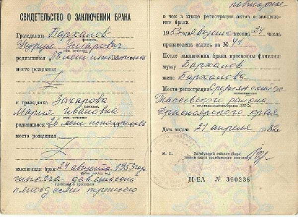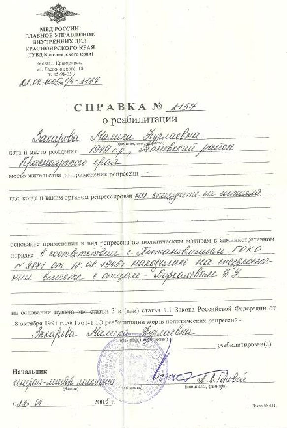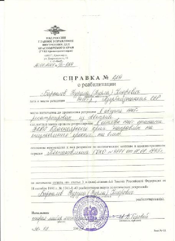 В нашей семье хранится справка за номером 629. В ней написано: «На основании пункта статьи 3 Закона Российской Федерации от 18 октября 1991г. №1761-1 «О реабилитации жертв политических репрессий" Бархалов Нурла Умарович реабилитирован». Всё вроде бы ясно и понятно, но какая была прожита жизнь? Что осталось на сердце, какая рана? Не дожил мой прадедушка до этих дней, не держал эту справку в руках.