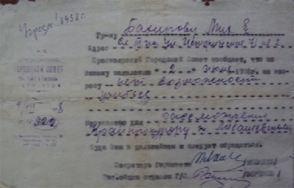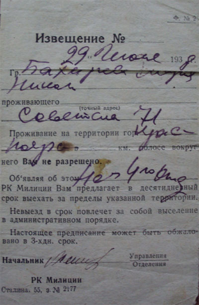Извещение о запрете жить в Красноярске. 1939год.