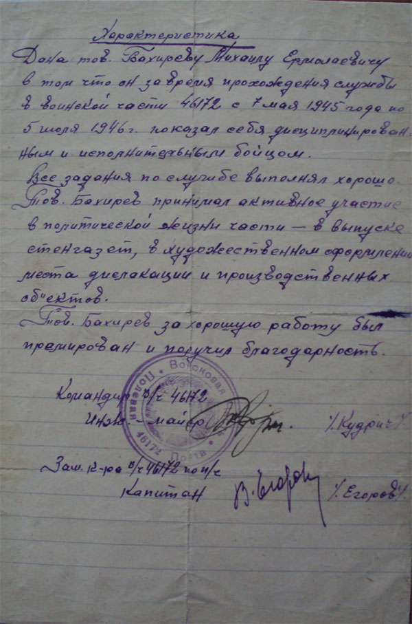 Солдат Бахирев вернулся с этой войны инвалидом второй группы. По его словам, “эхом прошедшей войны”, стали тоска, головные боли, плохой сон. Художник серьезно заболел. С большим трудом они покупают с братом не большой домик по улице Мелькомбинатской. Получить работу было сложно, кроме того, власти не забывали о том, что он личность неблагонадежная. Художник вспоминал:”Не помню точно, но кажется в 1938 году, я получил повестку явиться”срочно”в комнату №58 в органы КГБ, к капитану Дзюбе, который вел дело по следствию плена в котором я очутился…спустя лет 5 -6 после войны я еще ходил по повестке на допрос в КГБ по этому поводу. Мне не верили и проверяли, проверяли, проверяли”(орфография документа сохранена). Мы нашли документ о награждении художника медалью “За отвагу” от 20марта 1958года. Столько понадобилась властям, что бы оценить военные заслуги Михаила Ермолаевича.