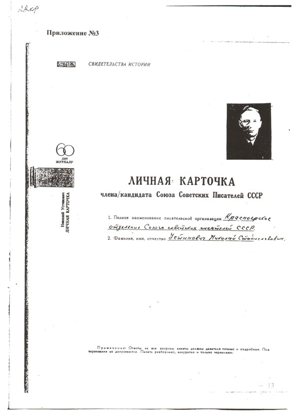«По сообщению УМГБ Красноярского края Устинович Н.С. среди своего окружения высказывает недовольства высокими требованиями, предъявляемыми партией к советским писателям, с антисоветских позиций критикует конференции и пленумы, проводимые Союзом советских писателей».