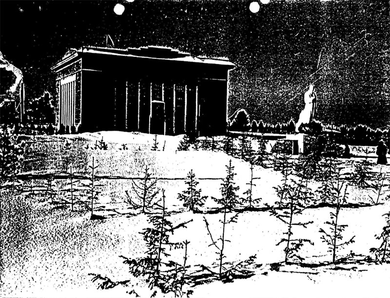 В 1952 году в Курейке было сооружено здание – пантеон над домиком Тарасеевых (приложение 4, листы 2-3). Под пантеоном были вырыты вентиляционные шахты. С их помощью производился климат-контроль: поддерживали определённую температуру внутри комплекса. Возвели рядом мощную котельную. Наружную облицовку сделали из мраморных плит. Высадили цветы и голубые ели. Установили красивые уличные светильники. Над входом в музей висел огромный бронзовый лик Сталина. Установили гипсовый памятник. До настоящего времени пантеон и изба не сохранились (приложение 4, лист 4).