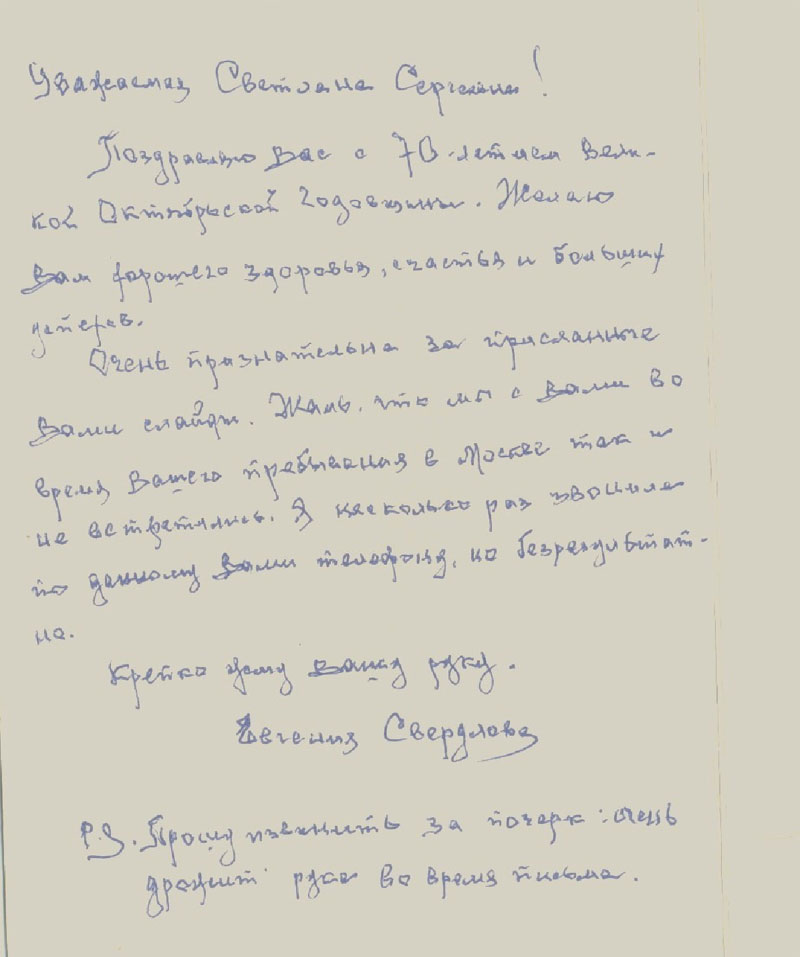 Автограф Евгении Яковлевны Свердловой