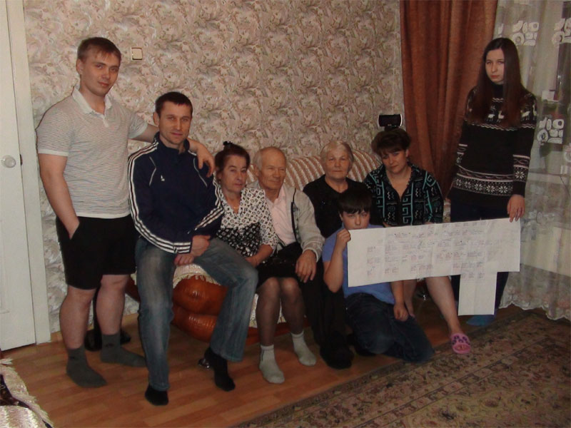 Затем я позвонила Александре Ивановне Лылиной, из рода Макаровых. Она сообщила мне контактные телефоны своих родных по линии Макаровых, Коноваловых, Константиновых. И у меня появилась идея снять встречи с её родными тоже на видео. Потом я составила вопросы интервью, начиная знакомство с потомками этих родов со слов: «Я, Андрианова Полина Игоревна, занимаюсь поисковой работой, в рамках которой провожу сбор информации о ваших предках Макаровых Матрёне Григорьевне и Михаиле Маркеловиче, Коноваловых Иване Степановиче и Таисье Михайловне, Константиновых Александре Петровиче и Домне Михайловне, а также их потомках и вопросы интервью:
