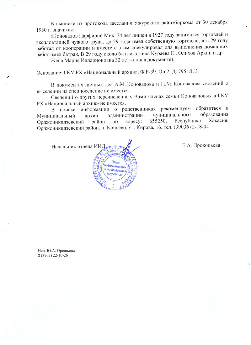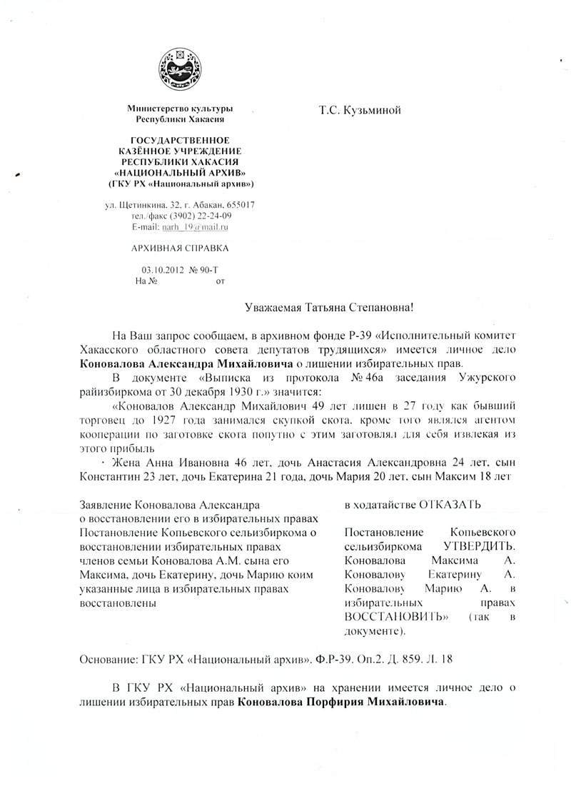1-я и 2-я страницы архивной справки о репрессии Коноваловых Александра и