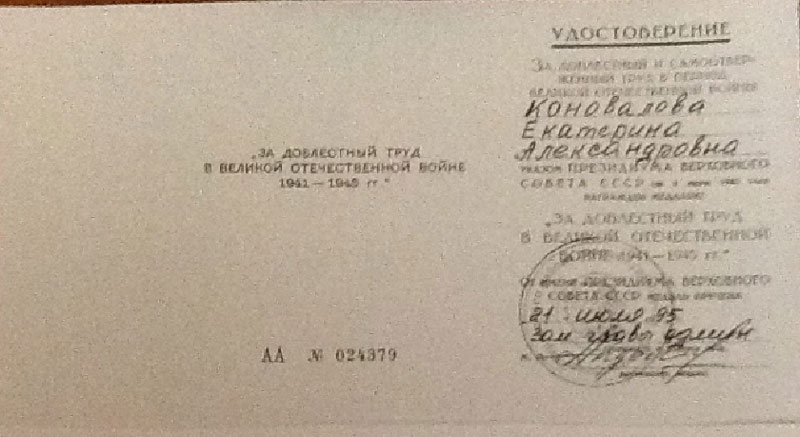 Удостоверение к медали «За доблестный труд в ВОВ»