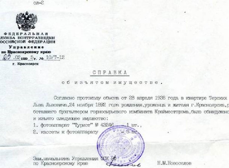 Их дети признаны в 1991 г. пострадавшими от политических репрессий: сын Льва Львовича- Терских Николай Львович[5] и дочь Петра Адриановича-Кручинина Любовь Петровна. Моя бабушка, Кручинина Ксения Матвеевна, являлась труженицей тыла и была награждена медалью «За доблестный труд в Великой Отечественной Войне»[6] в 1947 г. В семье сохранили фотографию, где она на курсах счетоводов.[7] Начала она свою трудовую деятельность в том же 1938 г., когда был репрессирован Кручинин Петр Адрианович. Мой отец, Терских Николай Львович,[8] 22мая 1922года рождения, родился в г. Красноярске. Военную службу проходил в Вооруженных Силах СССР с 07 1941г. по 5.08.1947г. Перед войной окончил Аэроклуб (осуществлял пробные полеты). После начала войны(22июня 1941г.) поступил в Оренбургское летное училище, которое было переформировано в артиллерийское училище. По окончании училища в 1943г. был назначен командиром огневого дивизиона реактивных огнеметов (КАТЮШ). Дошел до Берлина без ранений. Был награждён орденом и медалями.