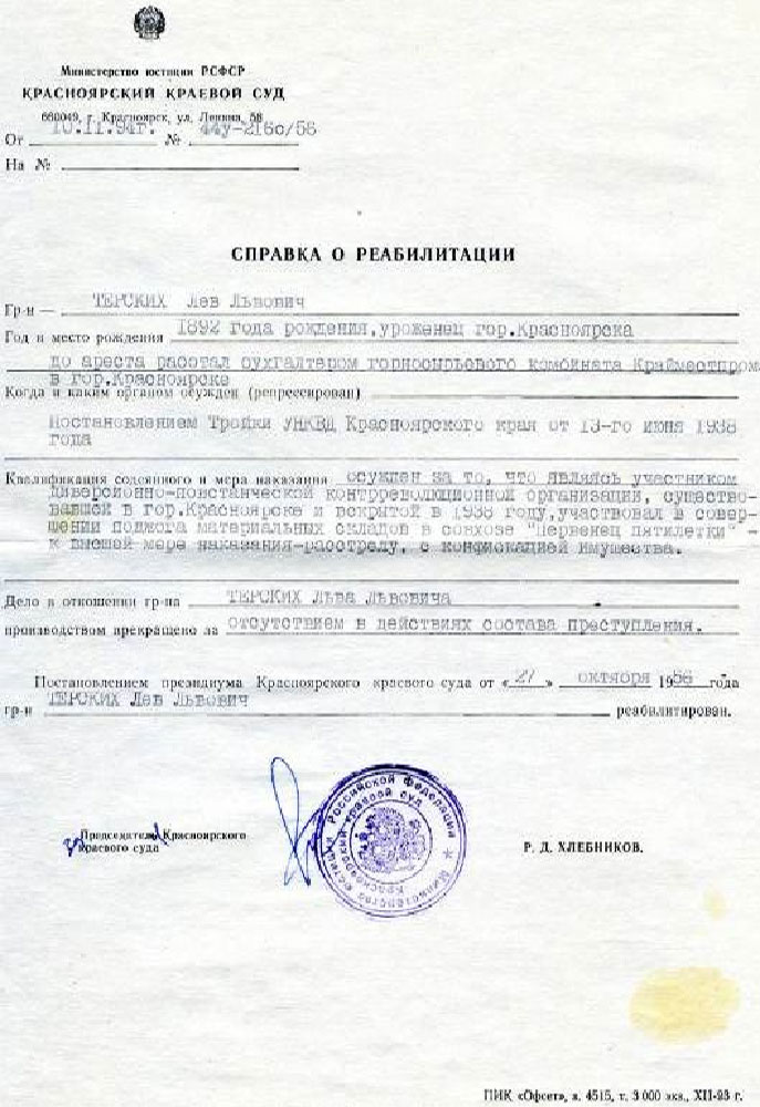 Терских Лев Львович- реабилитирован в 1956 г. [4]