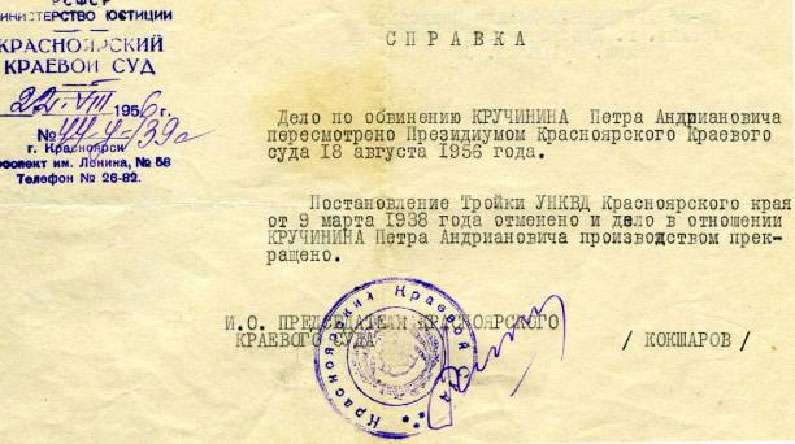Кручинин Петр Адрианович реабилитирован посмертно[4]