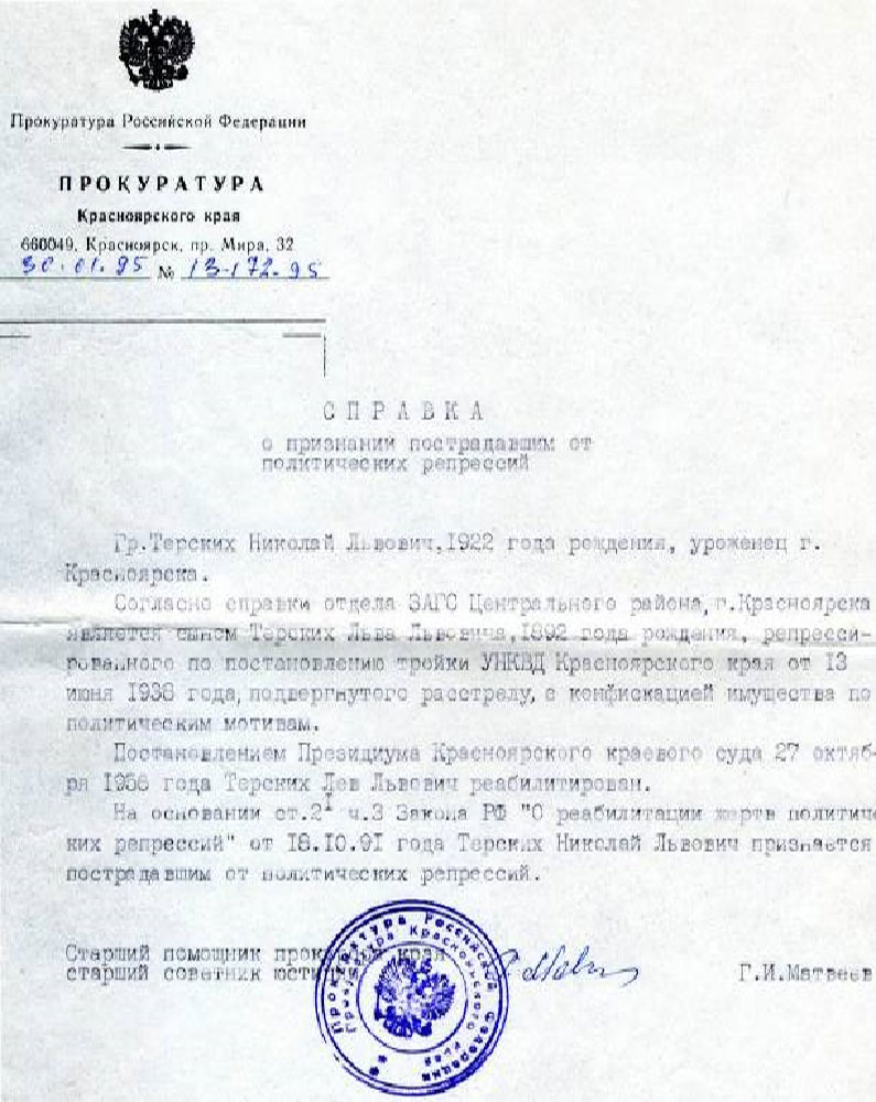 Терских Николай Львович в 1991г. Признан пострадавшим от политических
