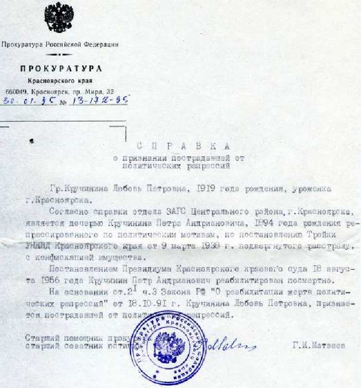 Кручинина Любовь Петровна признана в 1991г. Пострадавшей от политических