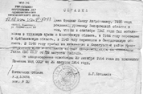Красноярского края и был поставлен на учёт спецкомендатуры, а в свидетельстве о