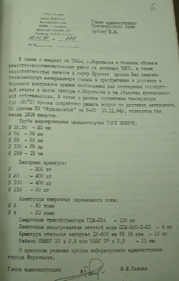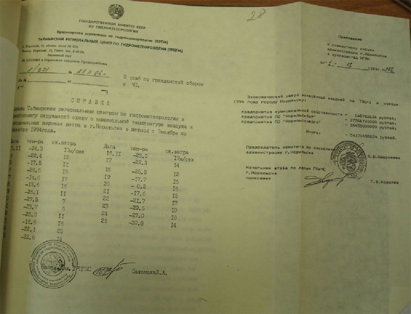 Из письма Председателю Правительства РФ Черномырдину В. С. о финансовой помощи городу Норильску для ликвидации аварии на ТЭЦ-1 от 15 декабря 1994 года, подписанным Главой администрации Красноярского края В. М. Зубовым, следует, что по заключению комиссии по чрезвычайным ситуациям Красноярского края, ущерб от аварии 3 ноября 1994 года в г. Норильске составил 54,3 млрд. рублей.
