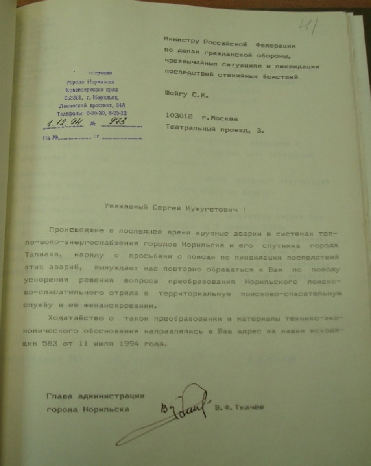 1 декабря 1994 года Постановлением администрации города Норильска в связи с необходимостью оперативного решения вопросов финансирования отдельных видов работ при ликвидации последствий аварии на ТЭЦ-1 и теплотрассах в Норильском промышленном районе был организован сбор добровольных взносов предприятий и граждан. 1 декабря главой администрации г. Норильска В. Ф. Ткачёвым на имя Министра РФ по делам ГО и ЧС и ликвидации последствий стихийных бедствий С. К. Шойгу было отправлено повторное письмо, которое содержало просьбу об ускорении решения вопроса о преобразовании Норильского поисково-спасательного отряда в территориальную поисково-спасательную службу и её финансировании. (Приложение 4)