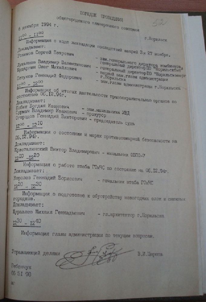 Согласно протокола планёрочного совещания при главе администрации г. Норильска,