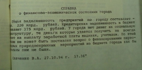 О дефиците бюджетных средств говорится и в справке от 27.10.1994 г. о финансово-экономическом состоянии города. (Приложение 6)